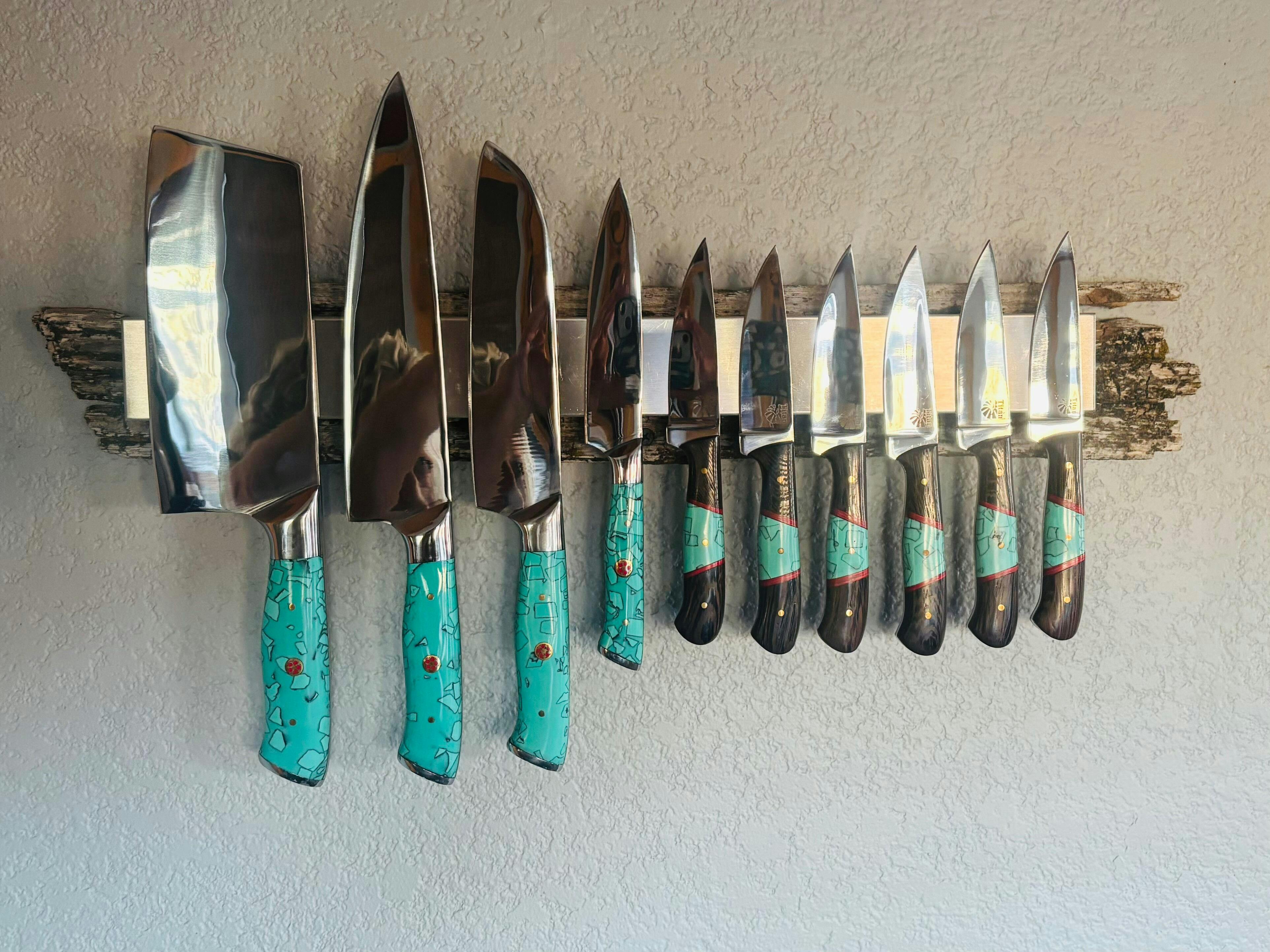 Each blade is forged from premium O2 tool steel and polished to a mirror-like finish, ensuring unmatched sharpness, durability, and resistance to wear. The vibrant turquoise handles, adorned with intricate patterns and brass accents, offer a comfortable grip while adding a touch of sophistication to your culinary tools.